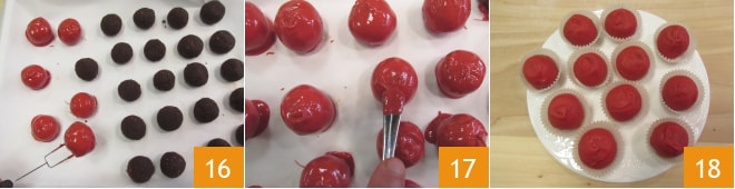Heben Sie die Kugeln mit dem entsprechenden Werkzeug oder mit einer Gabel ab und legen Sie sie erneut auf das Tablett mit Backpapier 16. Verwenden Sie das Ende des Griffs eines Teelöffels, um Dekorationen mit der roten Schokolade zu machen 17, dann stellen Sie sie für 1-2 Stunden in den Kühlschrank. Sobald sie getrocknet sind, servieren Sie Ihre roten Trüffel in Papierförmchen 18!