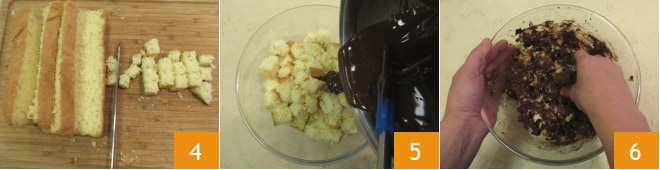 In der Zwischenzeit schneiden Sie den Biskuit in Würfel 4 und geben Sie ihn in eine Schüssel. Gießen Sie die geschmolzene Schokolade in die Schüssel mit dem Biskuit 5 und beginnen Sie mit einem Spatel zu mischen, dann kneten Sie mit den Händen 6.