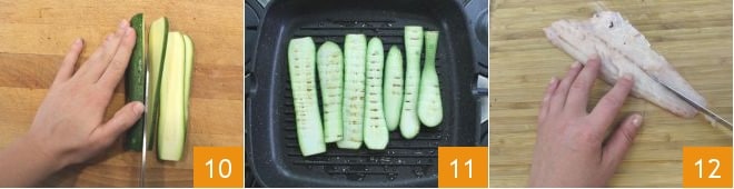 Kommen Sie nun zu den Zucchini: waschen Sie sie und schneiden Sie sie der Länge nach in sehr dünne Scheiben 10, grillen Sie sie dann einige Minuten auf jeder Seite auf einer heißen Grillplatte 11. Fahren Sie nun mit der Bildung der Röllchen fort. Schneiden Sie zuerst vertikal in der Mitte jedes Filets, um aus jedem 2 schmalere Filets zu gewinnen 12.