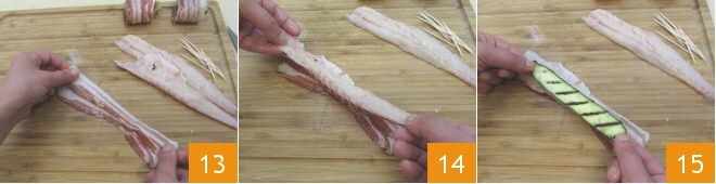 Legen Sie dann 3 Speckscheiben auf das Schneidebrett, eine über die andere 13, und legen Sie ein kleines Filet darauf 14. Schließlich legen Sie eine Scheibe gegrillte Zucchini auf das kleine Filet 15.