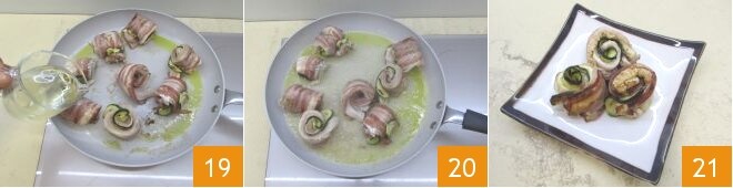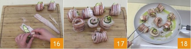 Rollen Sie den Speck, das kleine Filet und die Zucchini auf sich selbst, um Ihre Röllchen zu formen 16, und sichern Sie sie mit einem Zahnstocher, um zu verhindern, dass sie sich öffnen 17. Erhitzen Sie das Öl in einer großen Antihaftpfanne, und wenn es gut heiß ist, legen Sie die Röllchen hinein und braten Sie sie 2-3 Minuten an, wobei Sie sie mit einer Zange häufig auf allen Seiten drehen 18.