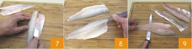 Drehen Sie den Fisch um und wiederholen Sie den Vorgang auf der anderen Seite, um auch das zweite Filet zu erhalten. Entfernen Sie mit einem scharfen Messer den zentralen rötlichen Teil der Filets 7 und entfernen Sie die restlichen Gräten mit einer speziellen Pinzette 8. Halten Sie das Messer horizontal und trennen Sie schließlich das Fleisch von der Haut 9. Wiederholen Sie dies mit dem zweiten Wolfsbarsch, um auch davon 2 filets ohne Haut zu erhalten.