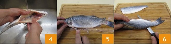 spülen Sie dann gründlich unter fließendem Wasser, um Blut und eventuelle Rückstände zu entfernen 4. Legen Sie ihn dann wieder auf das Schneidebrett, entfernen Sie den Kopf 5 und schneiden Sie mit einem Messer entlang der Wirbelsäule des Wolfsbarschs, parallel zur Gräte, um das erste Filet zu trennen 6.