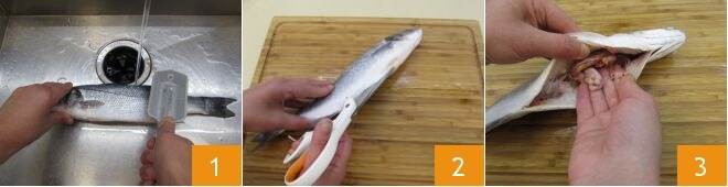 Um die Röllchen aus Wolfsbarschfilets zuzubereiten, kümmern Sie sich zuerst um die Reinigung der Fische. Nehmen Sie den ersten Wolfsbarsch, legen Sie ihn unter fließendes Wasser im Waschbecken und entfernen Sie die Schuppen mit einem speziellen Schupper 1. Schneiden Sie dann mit einer Schere entlang des gesamten Bauchs des Fisches bis zum Kopf 2. Entfernen Sie die Innereien 3,