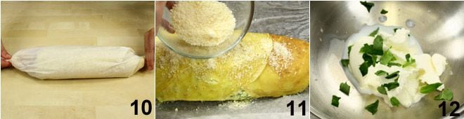 Schließen Sie die Rolle wie ein Bonbon, indem Sie die Enden des Papiers verdrehen 10 und backen Sie sie im Ofen bei 180° für etwa 30 Minuten. Öffnen Sie dann das Papier, bestreuen Sie die Rolle mit dem restlichen Grana Padano 11 und ein paar Butterstückchen und gratinieren Sie sie weitere 5 Minuten unter dem Grill. In der Zwischenzeit bereiten Sie die Basilikumcreme so zu: Geben Sie in einen Topf im Wasserbad 2 Esslöffel Philadelphia mit einigen Basilikumblättern 12, zwei Esslöffel Milch, Grana Padano und eine Prise frisch gemahlenen Pfeffer, nehmen Sie die Soße vom Herd, sobald sie heiß ist. Servieren Sie die Pfannkuchenrolle mit Zucchini in Scheiben, beträufelt mit der Basilikumcreme!
