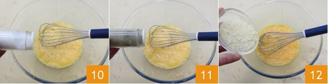 und fügen Sie das Salz 10, den Pfeffer 11 und den geriebenen Käse 12 hinzu.