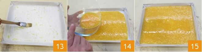Nehmen Sie ein Backblech mit einer Größe von etwa 34x27 cm, legen Sie es mit Backpapier aus und bestreichen Sie es mit wenig Öl 13. Gießen Sie die Mischung ein 14 und backen Sie das Omelett im vorgeheizten statischen Ofen bei 180° für 15 Minuten oder bei 160° für 5-8 Minuten im Umluftofen 15.