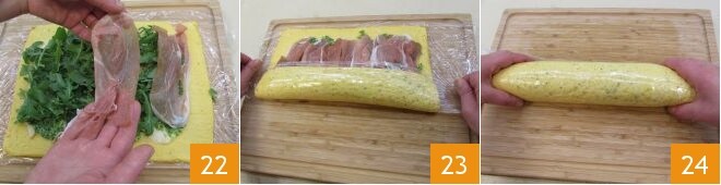und beenden Sie es schließlich mit einer Schicht rohem Schinken 22. Rollen Sie das Omelett auf 23 und wickeln Sie es fest mit Frischhaltefolie ein 24, um es kompakt zu halten und die Form zu bewahren.