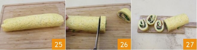Legen Sie dann die gefüllte Omelettrolle in den Kühlschrank, damit sie mindestens 1 Stunde lang fest wird und Geschmack bekommt. Nach der benötigten Zeit entfernen Sie die Frischhaltefolie vorsichtig von der Rolle 25, schneiden Sie sie in Scheiben 26 und Ihre gefüllte Omelettrolle ist bereit zum Servieren 27!