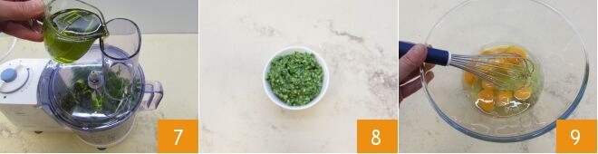 Beginnen Sie, alles bei niedriger Geschwindigkeit zu mixen 7 und fügen Sie nach und nach das restliche Olivenöl extra vergine in einem dünnen Strahl hinzu, bis eine gut vermischte und flüssige Creme entsteht 8. Sobald Sie das Rucolapesto zubereitet haben, stellen Sie es beiseite und beginnen Sie, das Omelett vorzubereiten: Schlagen Sie die Eier in einer Schüssel 9