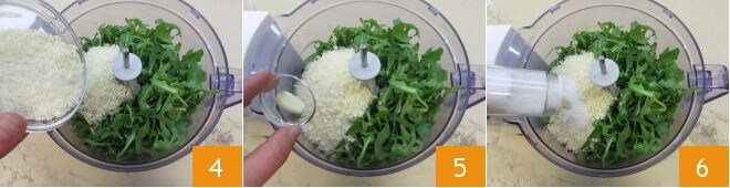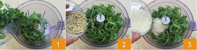 Um die gefüllte Omelettrolle vorzubereiten, beginnen Sie mit der Zubereitung des Rucola-Pesto, das für die Füllung benötigt wird. Waschen Sie die Rucola sehr gut unter reichlich kaltem fließendem Wasser, trocknen Sie sie und geben Sie sie in den Mixerbehälter 1: Fügen Sie die Pinienkerne hinzu 2, den geriebenen Grana Padano 3