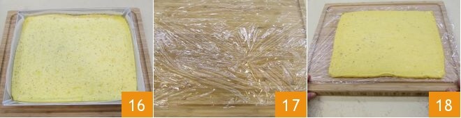 Wenn das Omelett fertig ist, nehmen Sie das Blech heraus 16, legen Sie Frischhaltefolie auf ein Schneidebrett 17; stürzen Sie das Blech darauf und ziehen Sie das Backpapier vorsichtig ab, dann lassen Sie es abkühlen 18.