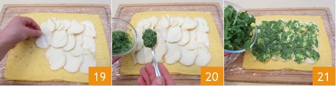 Wenn das Omelett abgekühlt ist, füllen Sie es, indem Sie die Scamorza-Scheiben darauflegen 19 und mit dem zuvor zubereiteten Rucolapesto bestreuen 20. Bedecken Sie es dann mit frischen, vorher gewaschenen Rucolablättern 21