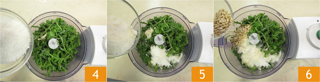 Fügen Sie auch den geriebenen Grana Padano 4, den Pecorino 5 und die Pinienkerne 6 hinzu. Beginnen Sie bei niedriger Geschwindigkeit zu mixen.