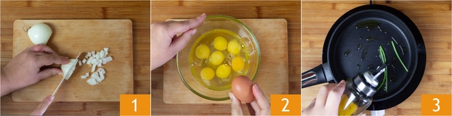 Um die Rühreier mit Tomaten zuzubereiten, schneiden Sie zuerst die Zwiebel fein 1 und schlagen Sie die Eier in eine Schüssel 2. Geben Sie in eine Pfanne etwas Petersilienstiele, gießen Sie das Öl hinzu 3 und erhitzen Sie es für 2 Minuten.
