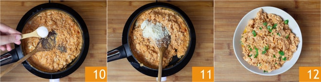 Mit Salz und Pfeffer abschmecken 10. Zum Schluss den geriebenen Parmesan hinzufügen 11 und einige Minuten vermengen. Anrichten und mit frischer, gehackter Petersilie garnieren. Die Rühreier mit Tomaten sind bereit zum Genießen 12.