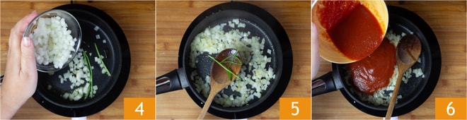 Fügen Sie die Zwiebel hinzu 4 und braten Sie sie bei starker Hitze für 3 Minuten an. Entfernen Sie die Petersilienstiele 5 und geben Sie die Tomatenpassata hinzu 6. Kochen Sie alles bei niedriger Hitze für 10-12 Minuten.