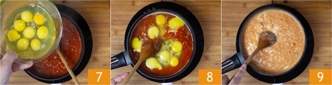 Geben Sie die Eier in die Pfanne 7 und rühren Sie, um die Eigelbe zu brechen 8. Kochen Sie etwa 10 Minuten lang, gelegentlich umrühren 9.