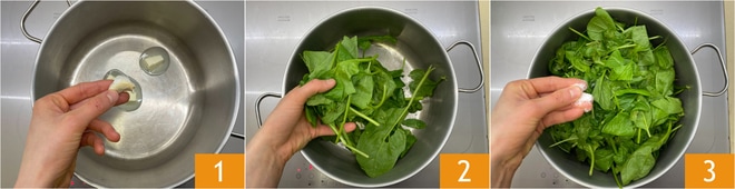 Um den rustikalen Ricotta und Spinat zuzubereiten, geben Sie zuerst die Butter und den Knoblauch in einen Topf 1. Wenn die Butter geschmolzen ist, fügen Sie den Spinat hinzu 2 und salzen Sie nach Geschmack 3.