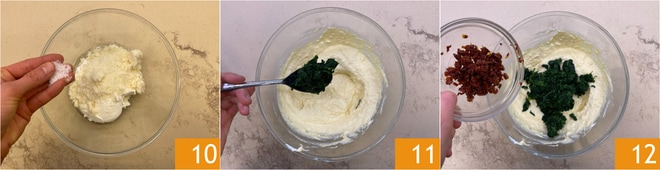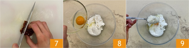 Hacken Sie auch die getrockneten Tomaten 7. Geben Sie in eine Schüssel den Ricotta, fügen Sie das Ei hinzu 8 und den Grana 9.