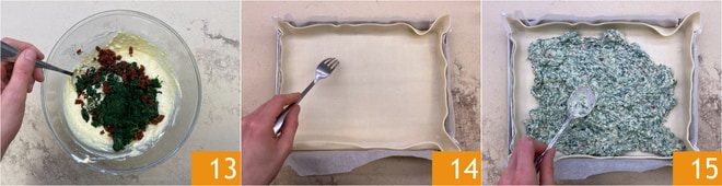 Mischen Sie gut 13, um alle Zutaten zu vereinen. Legen Sie den Blätterteig mit seinem Backpapier in eine Form von 30x23 cm, sodass er gut am Boden und an den Rändern haftet. Stechen Sie den Boden mit einer Gabel ein 14. Fügen Sie die Füllung hinzu und glätten Sie sie 15.