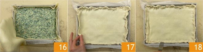Bedecken Sie es mit einem anderen Blatt Blätterteig 16 und falten Sie die Ränder nach außen 17, dann versiegeln Sie sie mit den Zinken einer Gabel 18.