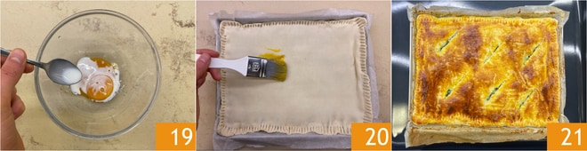 In einer kleinen Schüssel schlagen Sie das Eigelb mit einem Esslöffel Milch 19 und bestreichen Sie den rustikalen Teig mit dieser Mischung 20. Schneiden Sie die Oberfläche ein, um einen Dampfablass während des Backens zu schaffen. Backen Sie bei 200°C im statischen Ofen für 25-30 Minuten. Ihr rustikaler Ricotta und Spinat ist bereit zum Genießen 21.