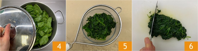 Decken Sie mit dem Deckel ab 4 und lassen Sie es bei schwacher Hitze 5 Minuten kochen. Lassen Sie es in einem Sieb abkühlen und drücken Sie den Spinat aus 5, dann hacken Sie ihn mit einem Messer 6.