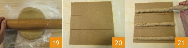 Nehmt den Mürbeteig aus dem Kühlschrank, entfernt die Folie, bestäubt leicht die Arbeitsfläche und rollt den Teig mit einem Nudelholz aus 19, um ein Quadrat von 30x30 cm zu formen. Schneidet die Ränder, um die richtige Größe zu geben, schneidet das Quadrat in 3 Streifen von 10 cm Breite 20. Mit dem Spritzbeutel eine Füllungslinie entlang der langen Seite jedes Mürbeteigstreifens ziehen 21.