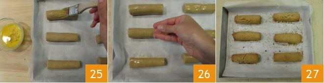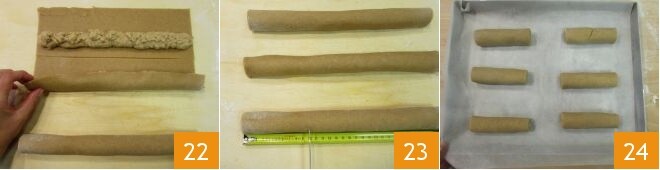 Den Mürbeteig rollen, um die Füllung vollständig zu bedecken und 3 Rollen zu formen 22. Lasst sie 5 Minuten im Kühlschrank ruhen. Schneidet dann jede Rolle in 3 Stücke von je 10 cm Länge 23 und legt sie auf ein mit Backpapier ausgelegtes Backblech 24.