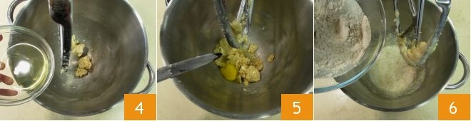 Arbeitet mit dem Flachrührer der Küchenmaschine, bis alle Zutaten vermischt sind. Gebt das Eiweiß 4, die Samen einer halben Vanilleschote 5 dazu und arbeitet erneut etwa 1-2 Minuten. Schließlich fügt das Mehl und das Backpulver hinzu 6.
