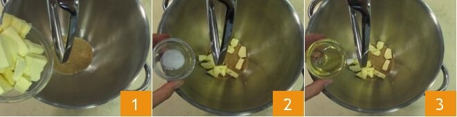 Um die rustikalen Apfelkekse zuzubereiten, fangt mit dem Mürbeteig an: Gebt in die Rührschüssel Zucker und kalte Butter in Stücken 1. Fügt auch eine Prise Salz 2 und den Akazienhonig hinzu 3.