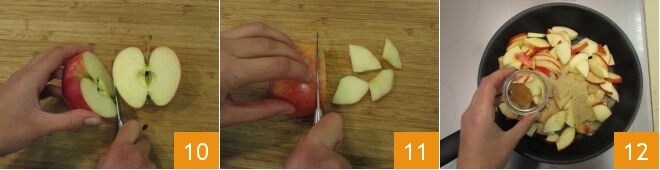 Bereitet die Füllung vor: Wascht und schneidet die Äpfel zunächst in Hälften 10 und dann in Spalten, entfernt das Kerngehäuse und die Kerne und schneidet sie in dünne Scheiben 11. Gebt die Äpfel in eine Pfanne mit Zucker und Zimt 12.
