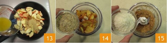 Gießt auch den Orangensaft hinzu 13 und kocht sie mit Deckel etwa 5 Minuten. Sobald sie fertig sind, gebt sie zusammen mit dem Haselnussmehl 14 und dem Mandelmehl 15 in den Mixer.