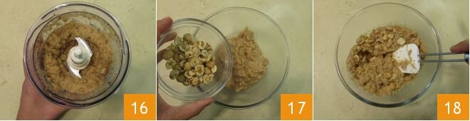 Mixen Sie einige Sekunden, um eine homogene Mischung zu erhalten 16. Grob gehackte Haselnüsse dazugeben und in einer Schüssel mit der Mischung vermengen 17, mischen 18 und die Füllung in einen Spritzbeutel umfüllen.