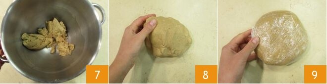 Arbeitet weiter, bis ein gleichmäßiger und kompakter Teig entsteht 7. Übertragt ihn auf eine Arbeitsfläche, formt ihn zu einer Kugel und wickelt ihn in Frischhaltefolie ein (8-9). Lasst den Teig mindestens 30 Minuten im Kühlschrank ruhen.