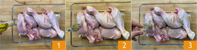 Um das rustikale Huhn mit Kartoffeln zuzubereiten, legt ihr zuerst die Hähnchenschenkel und Oberkeulen in eine Auflaufform, dann würzt ihr sie mit Öl 1, Salz, Oregano 2 und getrocknetem Thymian 3.