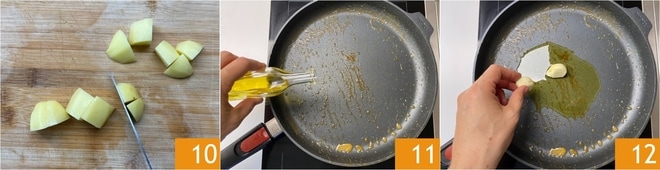In der Zwischenzeit die Kartoffeln schälen und in etwa 3 cm große Würfel schneiden 10. In dieselbe Pfanne, in der ihr das Huhn gekocht habt, etwas Öl geben 11 und die ungeschälten Knoblauchzehen 12.