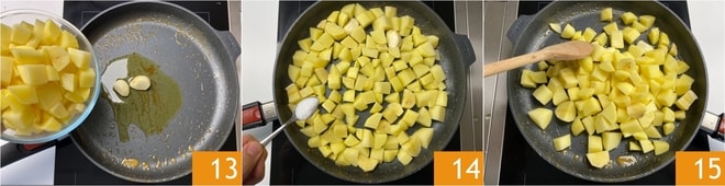 Die Kartoffeln hinzufügen 13, salzen 14 und bei mittlerer Hitze etwa 15 Minuten anbraten 15.