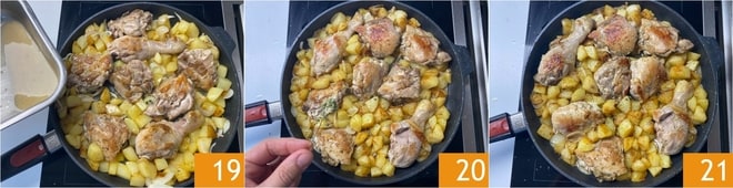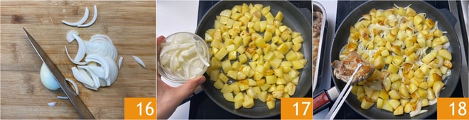In der Zwischenzeit die Zwiebel schälen und in Scheiben schneiden 16. Nach 15 Minuten haben die Kartoffeln Farbe angenommen, also den Knoblauch entfernen und zuerst die Zwiebel 17 und dann das Huhn 18 hinzufügen.