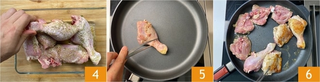Massiert das Fleisch gleichmäßig, um es zu würzen 4. Legt die Hühnerteile in eine bereits heiße, beschichtete Pfanne 5 und lasst sie etwa zehn Minuten lang bei mittlerer Hitze anbraten, ohne sie zu berühren. Wenn sie auf einer Seite gut gebräunt sind, dreht sie auf die andere Seite 6.