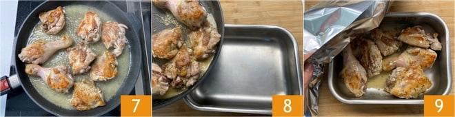 Nach etwa 5 Minuten mit Weißwein ablöschen und das Huhn weitere 10-15 Minuten kochen lassen, immer ohne es zu berühren 7. Nach dieser Zeit das Feuer ausschalten und das Huhn mit dem Bratensaft in eine Backform geben 8, dann mit Alufolie abdecken, um ein Austrocknen zu verhindern 9.