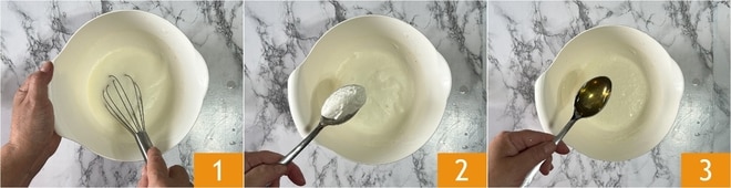Um die Sacher Cicciopancake zuzubereiten, schlagt die Eiweiße in einer Schüssel mit dem Schneebesen auf, bis sie schaumig sind 1. Fügt den griechischen Joghurt 2 und den Agavendicksaft 3 hinzu.