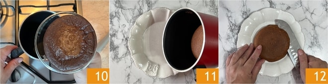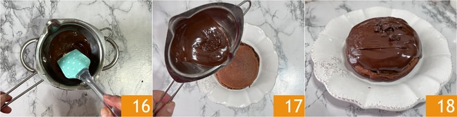 Schmelzt die Schokolade im Wasserbad oder in der Mikrowelle 16 und gießt sie über den Sacher Cicciopancake, um ihn zu bedecken 17, dann garniert mit Schokoladensplittern und serviert sofort 18.