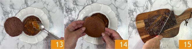Füllt die Innenseite mit Aprikosenmarmelade 13 und schließt ihn wieder 14. Hackt die dunkle Schokolade 15.