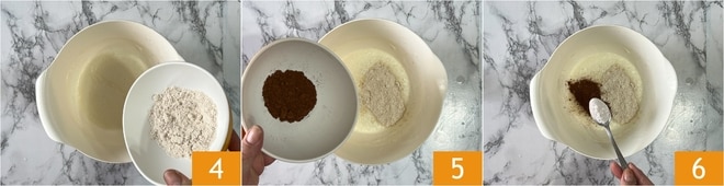 Fügt auch das Hafermehl 4, das Kakaopulver 5 und das Backpulver 6 hinzu.