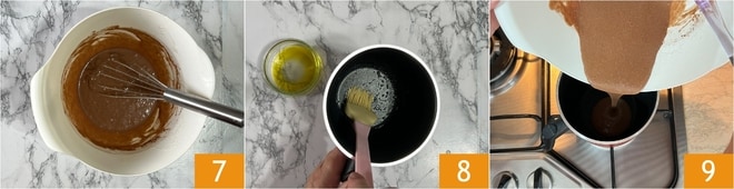 Mischt weiter, um eine homogene und klumpenfreie Masse zu erhalten 7. Fettet eine kleine Pfanne von etwa 12 cm Durchmesser und mit hohen Rändern mit Pflanzenöl ein 8 und erhitzt sie auf dem Herd. Gießt die Masse ein 9, deckt sie mit einem Deckel ab und kocht sie etwa 10 Minuten bei niedriger Hitze.