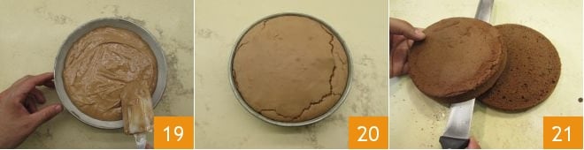 Fetten und mehlen Sie eine 18 cm Durchmesser große Form, gießen Sie dann die Mischung hinein, glätten Sie die Oberfläche 19 und backen Sie sie im vorgeheizten statischen Ofen bei 170 Grad für 35-40 Minuten. Überprüfen Sie nach dieser Zeit die Garzeit mit einem Zahnstocher, nehmen Sie dann den Kuchen aus dem Ofen 20; machen Sie sich keine Sorgen, wenn der Kuchen auf der Oberfläche rissig ist. Lassen Sie den Kuchen vollständig abkühlen, bevor Sie ihn auf einer Fläche umdrehen. Schneiden Sie dann den Kuchen in zwei Scheiben mit einem langen gezackten Messer 21.