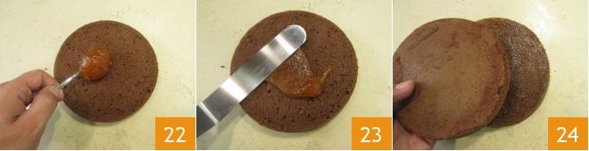 Geben Sie etwa die Hälfte der Aprikosenkonfitüre innen hinein 22 und verstreichen Sie sie mit einem Spatel über die gesamte Oberfläche 23. Decken Sie mit der zweiten Scheibe ab 24