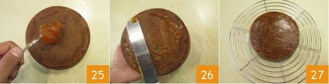 fügen Sie mehr Konfitüre auf die Oberfläche 25 hinzu und streichen Sie sie mit einem Spatel überall, um einen Schleier zu erzeugen, auch an den Rändern des Kuchens 26; auf diese Weise wird das Endergebnis glänzender. Stellen Sie den Kuchen auf ein Rost 27 und bereiten Sie die Ganache vor.